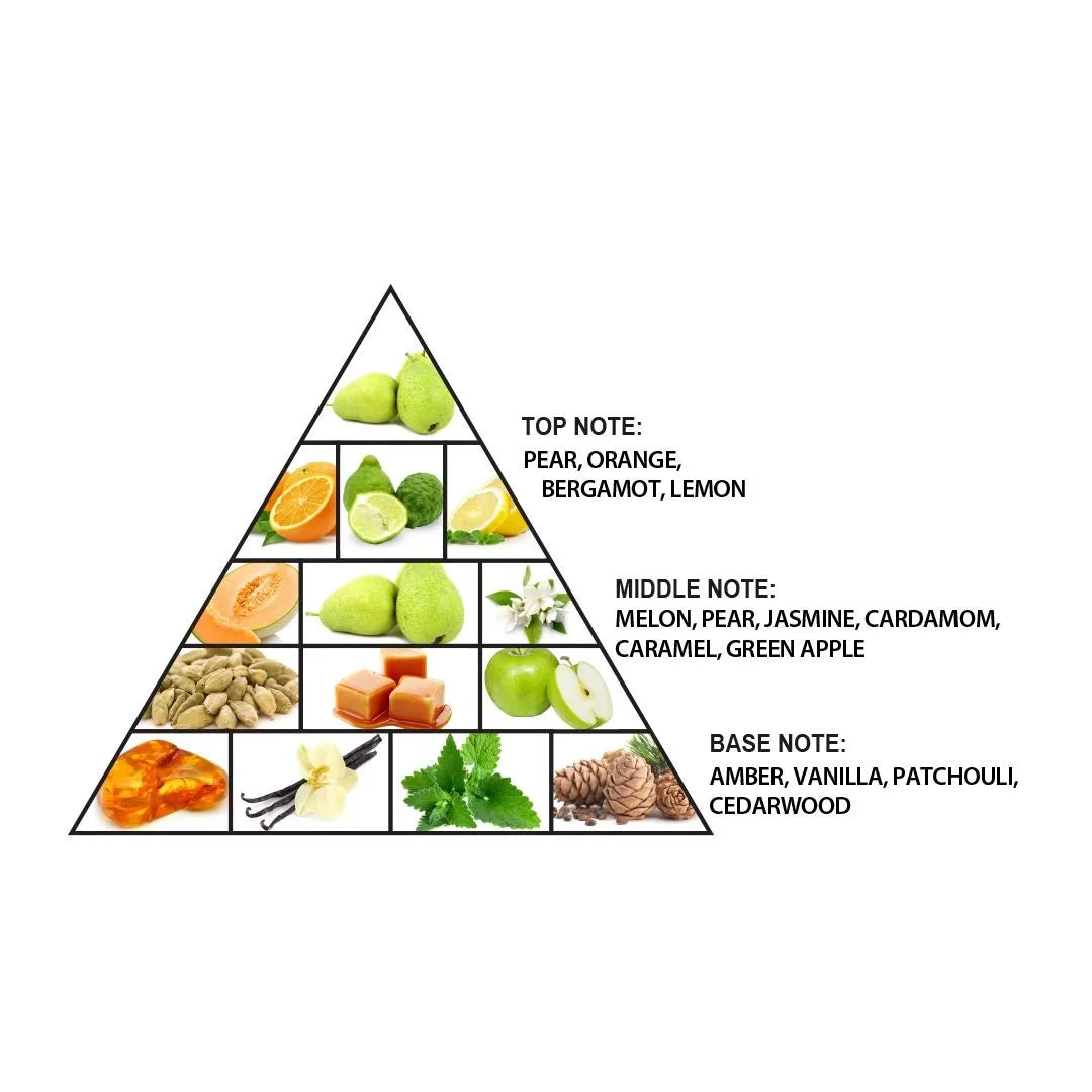 From the top notes of pear, orange, bergamot, and lemon to the heartwarming scent of melon, pear, jasmine, cardamom, caramel, and green apple, every note is a chapter in the captivating story of this metropolis. And, as you breathe in the grounding base notes of amber, vanilla, patchouli, and cedarwood, you'll feel a sense of rootedness amidst the excitement. It's a scent that invites you to immerse yourself in its captivating story and discover the true essence of Dubai.