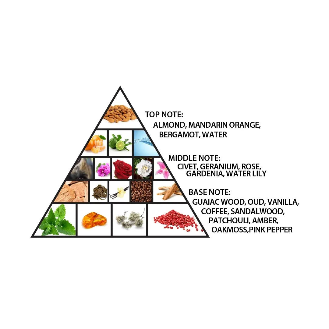 The base unfolds into a powerful, sensual foundation of guaiac wood, Laotian oud, vanilla, coffee, sandalwood, Indonesian patchouli leaf, amber, oakmoss, and pink pepper, leaving a warm, commanding trail that lingers for hours.