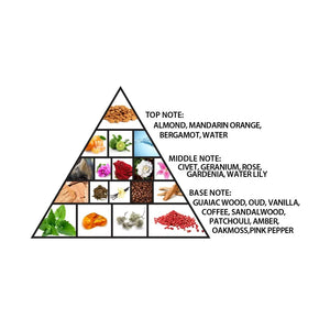 The opening captivates instantly with a vibrant blend of almond, mandarin orange, bergamot, and fresh watery notes, creating a bright and alluring introduction.